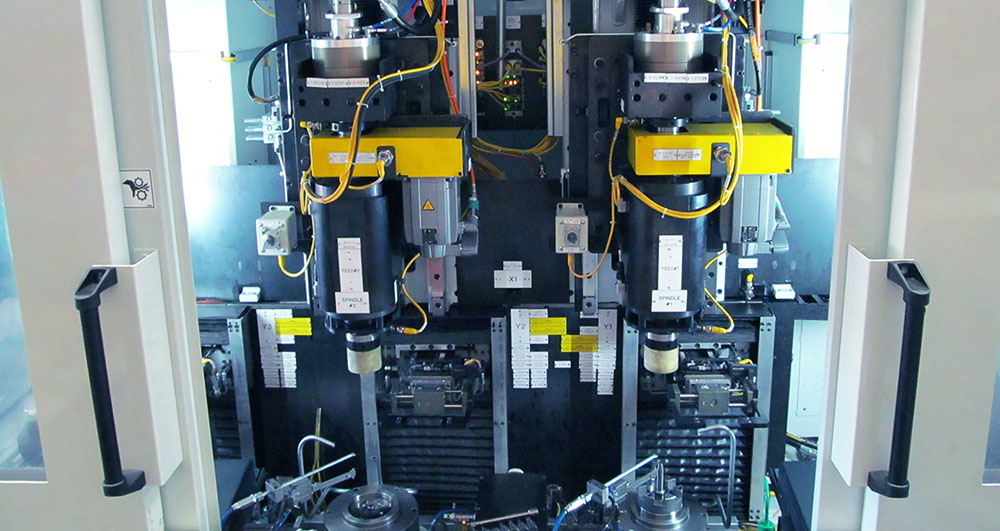Double spindle grinding machines can be used to either grind a part one side at a time or to grind 2 one-sided parts at a time. These machines are perfect for parts with a tight perpendicularity tolerance as well as parts that have unequal stock removal. Stock removal is achieved through in-process gauging for maximum size control and repeatability.