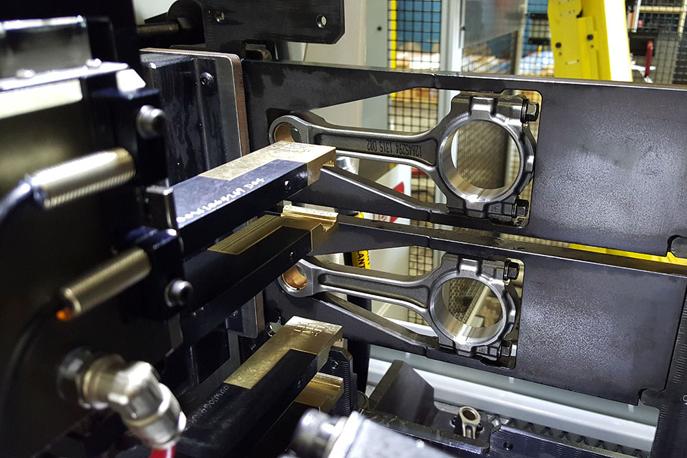 Integrated grinding cell corrects part orientation, checks via camera system for correct part number, robot loads 2 non-coplanar parts into the grinding machine, ground to size in one cycle, robot unloaded and gauged. Fully automated turn-key cell!